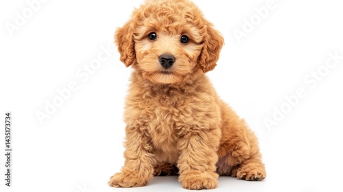 Adorable golden puppy sits against white background. Fluffy, small, and engaging