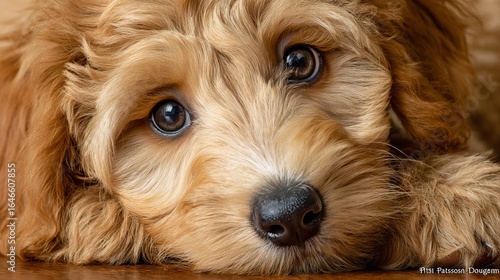 Adorable golden puppy with big expressive eyes, resting on a wooden floor.