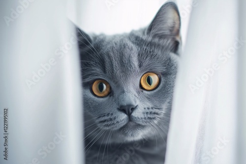Adorable gray cat with striking yellow eyes peeking through white curtains. Perfect for themes of pets, curiosity, and domestic animals