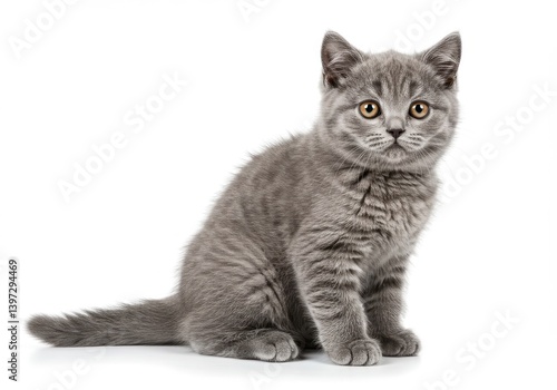 Adorable gray kitten sitting on a white background looking curious with bright eyes and fluffy fur