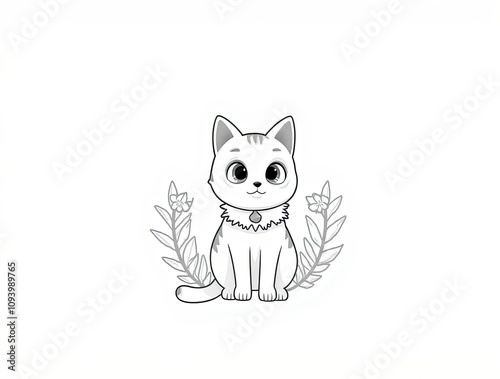 Adorable Gray Kitten with Big Eyes Sitting Amidst Delicate Floral Branches: A Charming Monochromatic Illustration