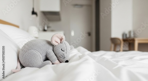 Adorable gray mouse stuffed toy asleep on a cozy white bed. Plush animal lying on soft bedsheet. Sweet dream and relaxing concept for a nursery.