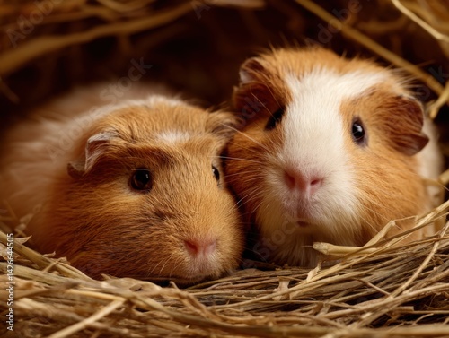 Adorable guinea pigs nestled in hay, representing companionship and comfort. Perfect for pet-related articles, animal care guides, and heartwarming content.