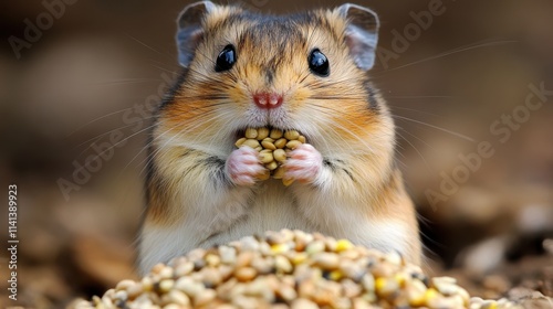 Adorable hamster holding seeds in paws. Perfect for pet food, animal, or nature websites.