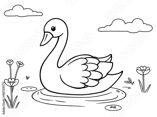 Adorable Hand-Drawn Swan Coloring Page: Serene Lake Scene Illustration. AI Generated