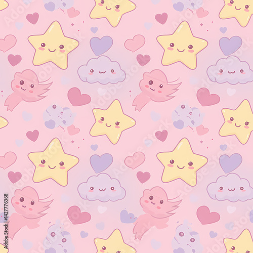 Adorable Kawaii Stars, Clouds, and Hearts Seamless Pattern