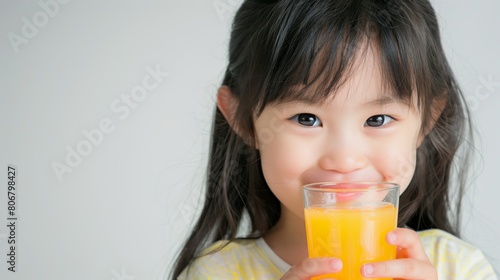 adorable kid drinking a glass of orange juice on a blurry light background. having breakfast.