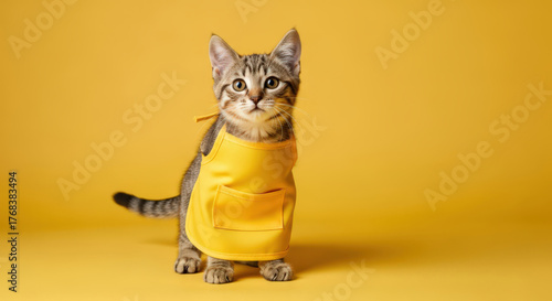 Adorable Kitten in a Yellow Apron A Charming Feline Friend Posing Against a Bright Background Showcasing its Playful Personality and Cute Appearance