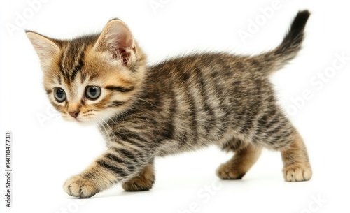 Adorable kitten in motion, brown tabby stripes. Tiny paws, alert eyes