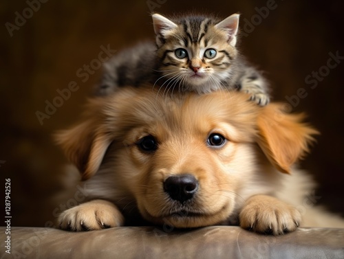 Adorable Kitten on Dog's Head, Heartwarming Pet Portrait, Ultra-Realistic Photography