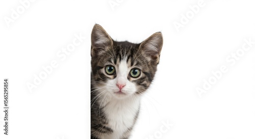 Adorable Kitten Peeking from Behind a White Wall A Cute Grey and White Tabby Cat Portrait