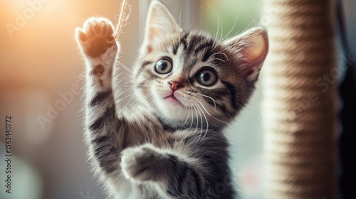 Adorable Kitten Playing with String near Scratching Post: A Playful Portrait of a Tabby