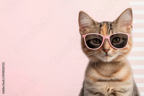 Adorable kitten portrait with sunglasses, cool and stylish cat on a pink background
