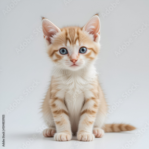 Adorable kitten sits softly, playful and curious on a clear white backdrop. Pure cuteness personified
