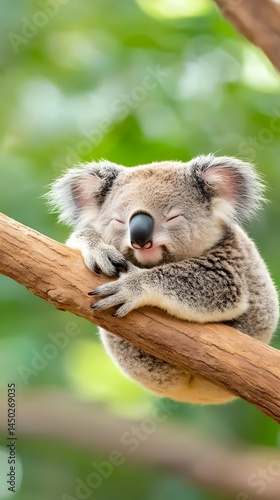 Adorable koala bear sleeping soundly on a tree branch amidst lush green foliage
