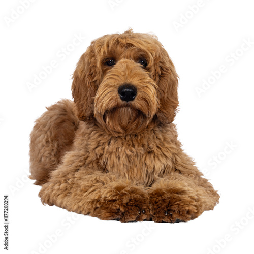 Adorable Labradoodle dog, laying down facing front. Looking towards camera. Isolated cutout on a transparent background.
