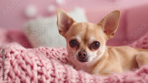 Adorable light brown Chihuahua dog relaxing in a pink living room environment