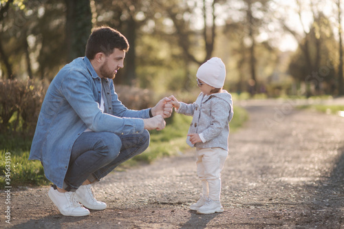 Adorable little gilr spend time with her father. Dad and daughter walk in the park. Stylish family. Happy little girl in sunglasses. Dad give some present to daughter