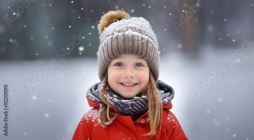 Adorable little girl having fun in beautiful winter park during snowfall. Cute child playing in a snow. Winter activities for kids.