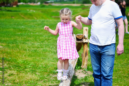 Adorable little girl with father holding her hand walking on wood on sunny summer day