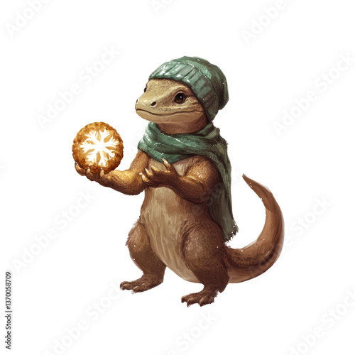 Adorable Lizard in Winter Hat Holding Snowflake Cookie