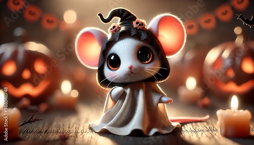 Adorable mouse in witch costume with a hood and cape, cute Halloween mouse surrounded by jack-o-lanterns and candles, festive animal portrait