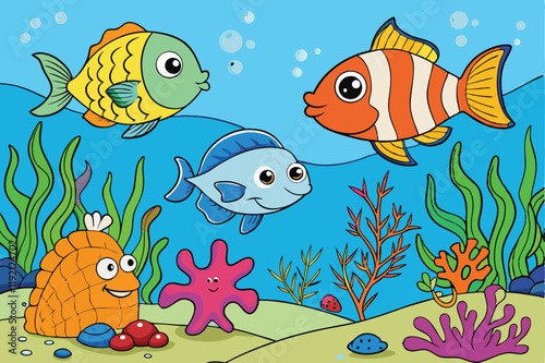 Adorable ocean themed cartoon illustration featuring happy fish, seaweed, and coral reef, ideal for childrens activities and designs
