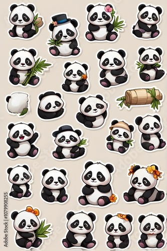 Adorable Panda Stickers: A Collection of Cute Panda Bears in Various Poses and Outfits