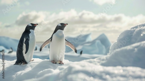 Adorable penguins exploring a snow-covered area.