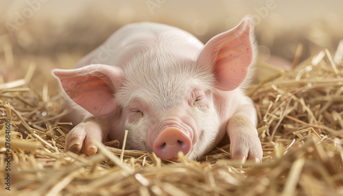 Adorable piglet resting on straw in a barn, capturing the essence of farm life and animal relaxation.