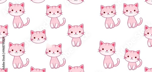 Adorable pink cartoon cat repeating pattern on white background, animal, cat pattern