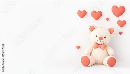 Adorable plush teddy bear sitting against a clean white background with floating hearts, perfect for love-themed projects