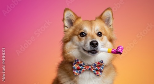 Adorable Pomeranian Dog Celebrating Birthday with Party Horn and Bow Tie Against a Vibrant Gradient Background