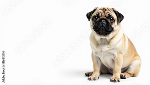 Adorable pug dog sits alone on white background, dog breed, companion animal