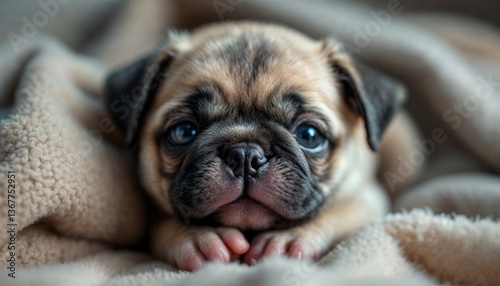Adorable Pug Puppy Sleeping on Soft Blanket