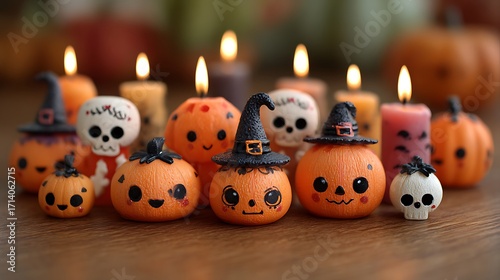 Adorable pumpkins with happy spooky faces, tiny skulls, candles, and witch hats on orange