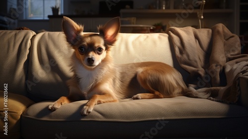 Adorable Pup Relaxing on a Cozy Sofa in a Bright Room