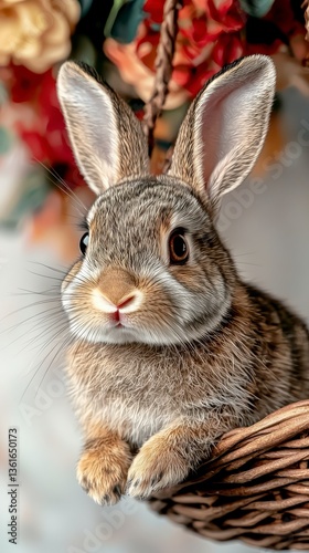 Adorable rabbit sitting in a basket within a bright creative workspace surrounded by artistic tools and natural light