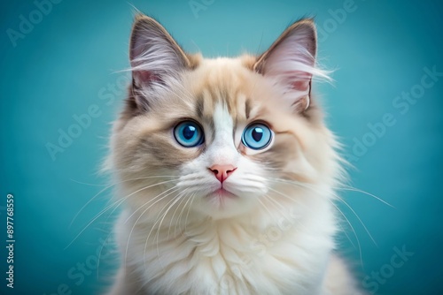 Adorable ragdoll cat with soft, fluffy fur and big bright eyes gazes curiously against a serene pastel blue background, exuding innocence and sweetness.