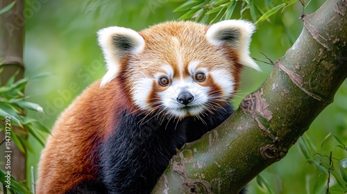 Adorable red panda perched on a tree branch, looking directly at the camera.