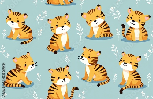 Adorable seamless pattern featuring cute cartoon tigers, perfect for textile, fabric, wallpaper, kids decor. Playful illustration with happy tiger characters. Ideal for children apparel, nursery