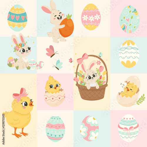 Adorable set of Easter bunnies, chickens, colorful eggs and spring flowers. Seamless pattern