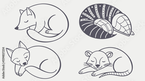 Adorable sleeping animals vector illustrations set. Minimalist line art of curled up fox, cat, armadillo, and mouse for cute, calm, and peaceful design projects.