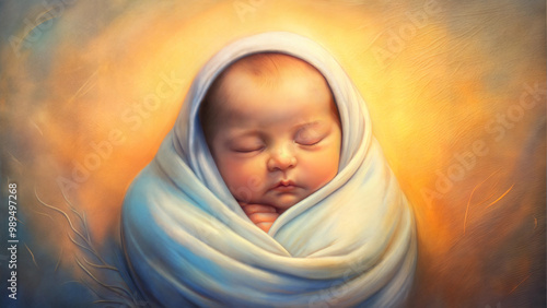 Adorable sleeping baby wrapped in a soft blanket with a warm glowing background