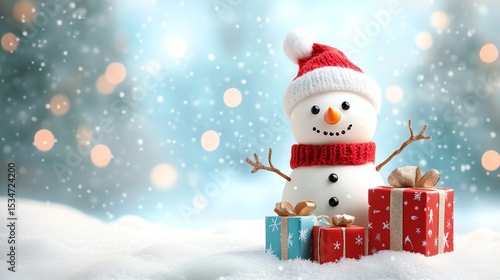 Adorable snowman in Santa hat with Christmas gifts, snowy winter scene. Perfect for holiday cards and festive designs.