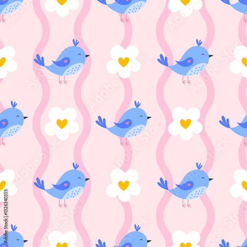Adorable springtime vector seamless pattern with sparrows, chamomile flowers, and gentle wavy accents, in pastel tones, ideal for textile designs, holiday celebrations, and soft baby clothing