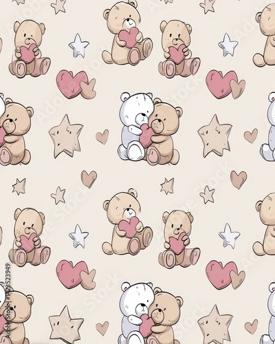 Adorable teddy bear pattern with hearts and stars. A sweet design for children's decor and gifts. Expressing love and warmth with cuddly charm.