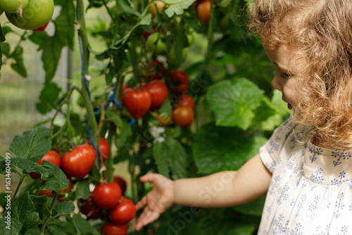 Adorable toddler admiring homegrown tomatoes. Perfect for agriculture, family, and healthy eating concepts.