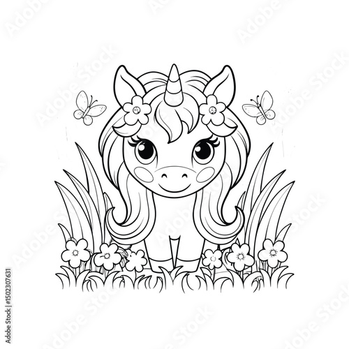 Adorable Unicorn Coloring Page Magical Creature in Flower Meadow
