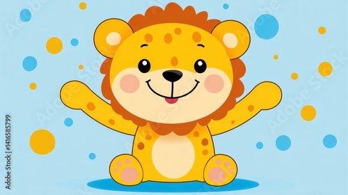 Adorable vector illustration featuring a cheerful lion cub amidst playful polka dots in a gentle pastel color scheme offering childlike appeal